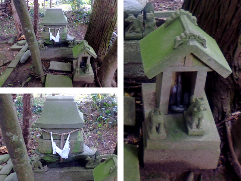 Coordinates: 35.4265538,133.251061Another fox shrine with a fox dump. Maybe that's a thing in this area? Or maybe an earthquake struck and this is the result? Anyway, this is a side shrine of Yasugi Jinja (安来神社 "Relaxed Coming Shrine"), and in addition to the dump of tiny porcelain foxes it also features about a dozen weathered stone foxes ranging from life-sized to small. The life-sized ones are depicted wearing Shimenawa-collars, which I assume is meant to identify them as divine guardians.